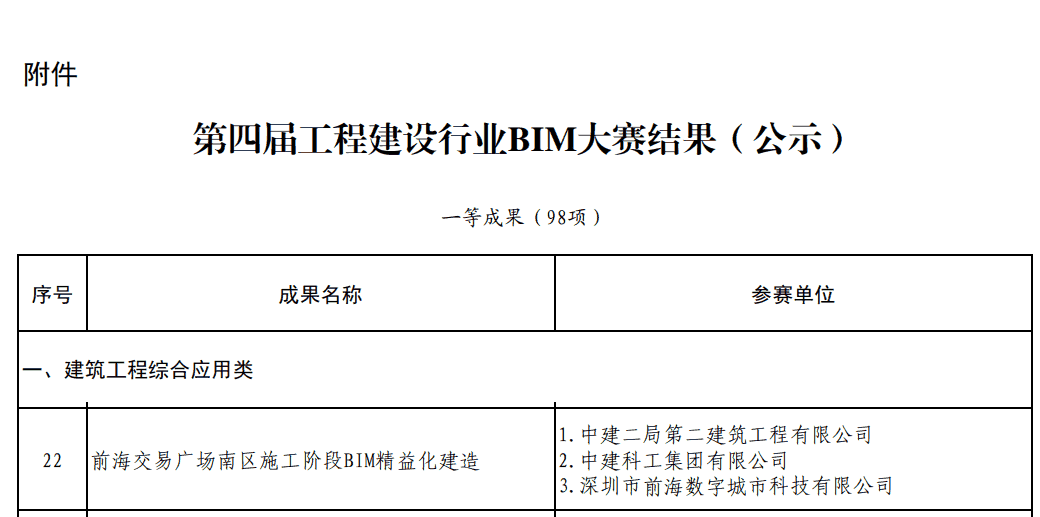 近日,由中国施工企业管理协会主办的第四届工程建设行业BIM大赛结果公示,前海数科提报的《前海交易广场南区施工阶段BIM精益化建造》在本届共计3153项提交成果中脱颖而出,荣获一等成果!